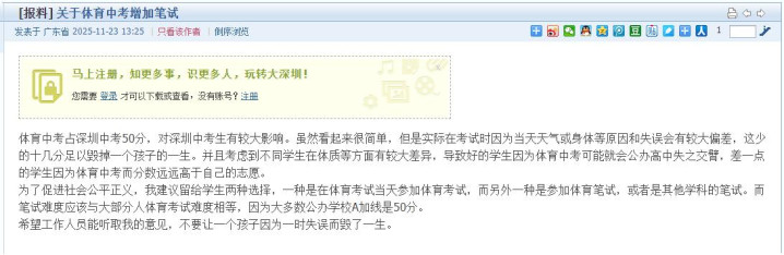 日前,有深圳家长在“深圳论坛”上建议中考体育增加笔试,就引发了网友热议。